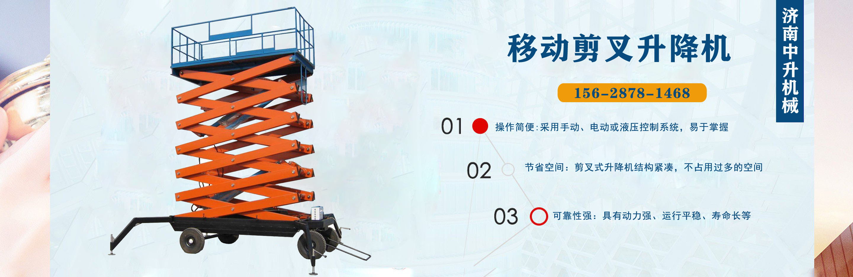 濟南中升機械制造有限公司主營移動升降機,小型移動升降機,移動式升降機,移動剪叉升降機,移動剪叉式升降機等產品,信譽良好,歡迎前來咨詢訂購! 在銷售上,尊重每一個客戶,做到保質、保量及時供貨;在售后服務上,以較短的時間,用較快的速度解決,終身追蹤服務?! 」臼冀K以“品質為本,服務至上”為公司宗旨。致力于提供高品質的產品,完善的服務,快捷的供貨,無論您身處何方,都能感受到我們的優良服務。客戶至上,誠信為本。 歡迎各界朋友來電,來函垂詢,選購!...